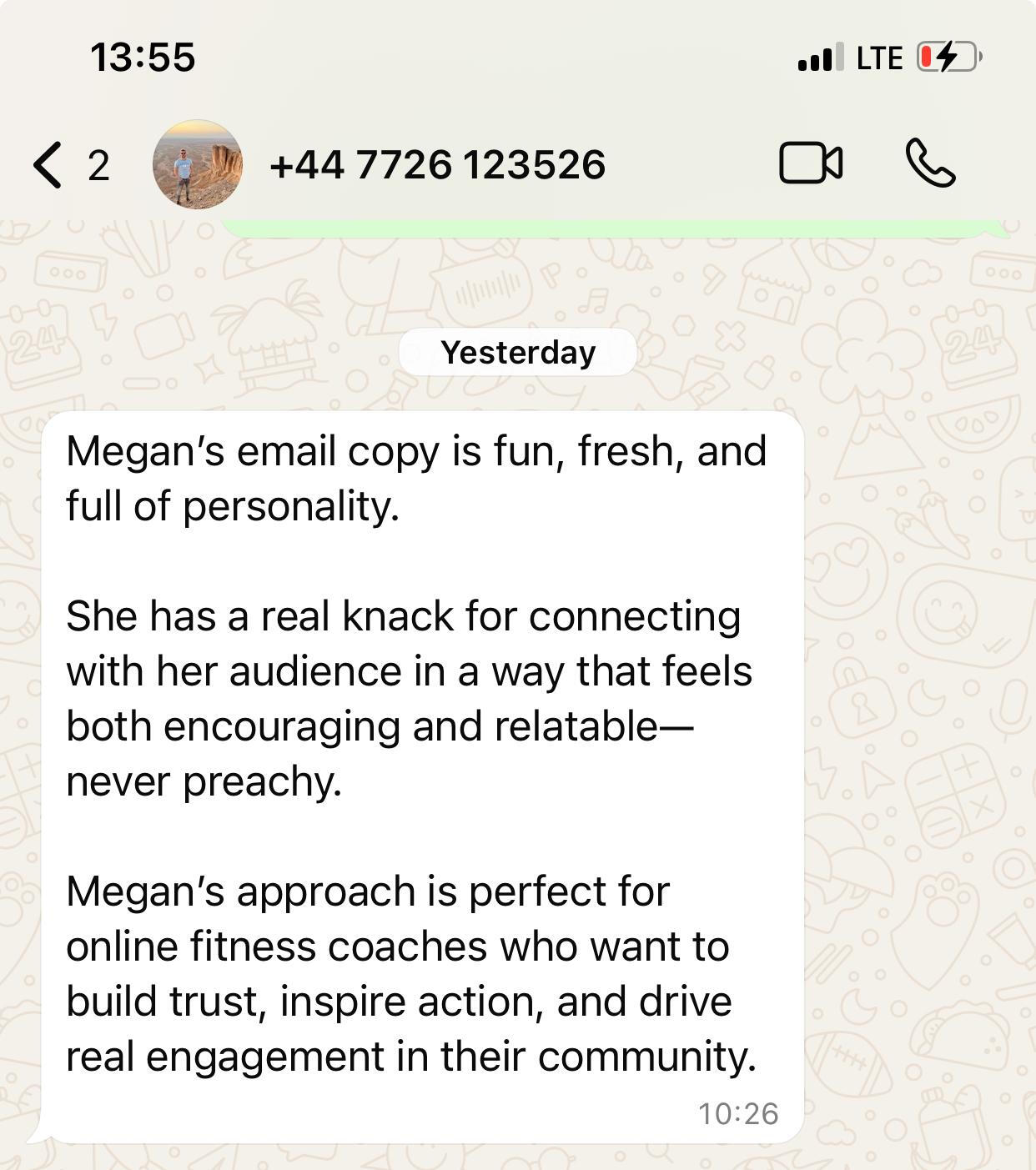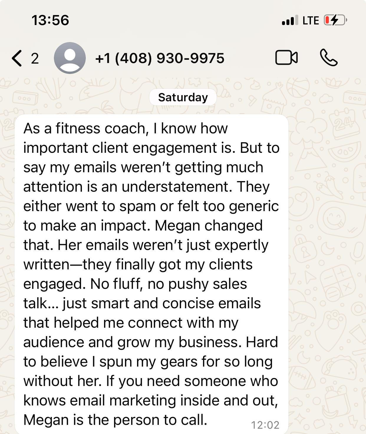Hey there! I'm Megan, your go-to expert for empowering online fitness coaches specializing in women's weight loss. 🌟I help you boost your wealth by maximizing your email lists, ensuring your message resonates and engages effectively. With a passion for healthy eating, I prepare clean meals daily, fueling my dedication to wellness and inspiring my clients to achieve their goals.✨ Check out my testimonials and samples here! If you’re ready to elevate your email marketing strategy, I’m excited to announce that I’m looking to take on one more client this month.📧 Let’s connect! Email me at [email protected], and let’s chat about how we can work together to transform your business!